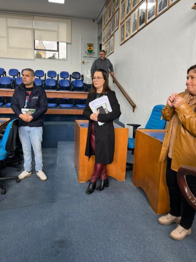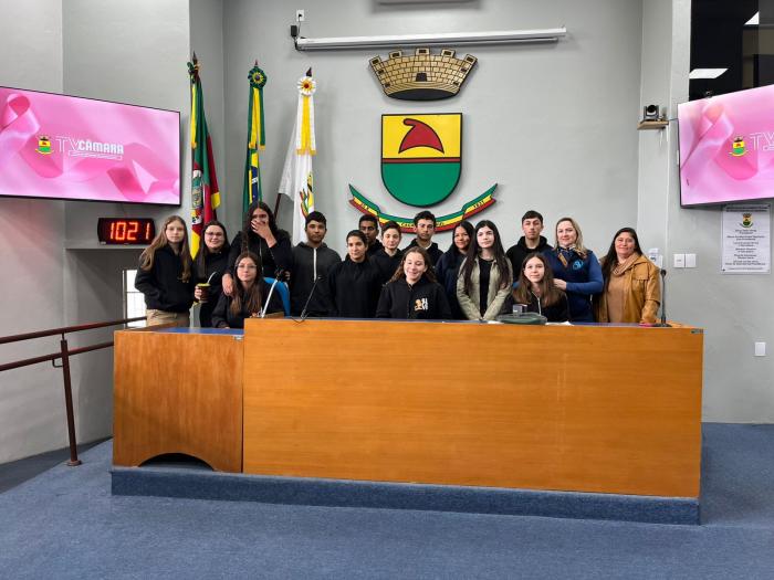 Na quarta-feira (01), os alunos do oitavo ano da Escola Dagoberto Barcelos estiveram na Câmara de Vereadores, acompanhados da vice-diretora Marta Lagner e da intérprete de Libras, Joselaine Alves.