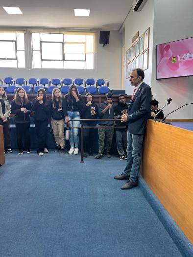 A visita foi guiada pelo assessor Charles Teixeira, que apresentou aos estudantes as dependências da Câmara e explicou o funcionamento do Parlamento Municipal e o papel dos vereadores na comunidade.