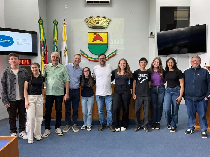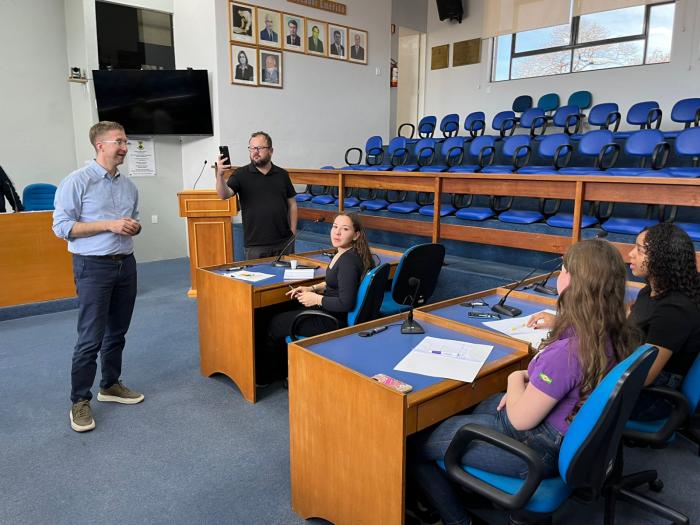 Durante sua passagem pela Câmara, o secretário acompanhou uma atividade do Projeto Aluno Cidadão, conversando com estudantes e representantes das escolas participantes.