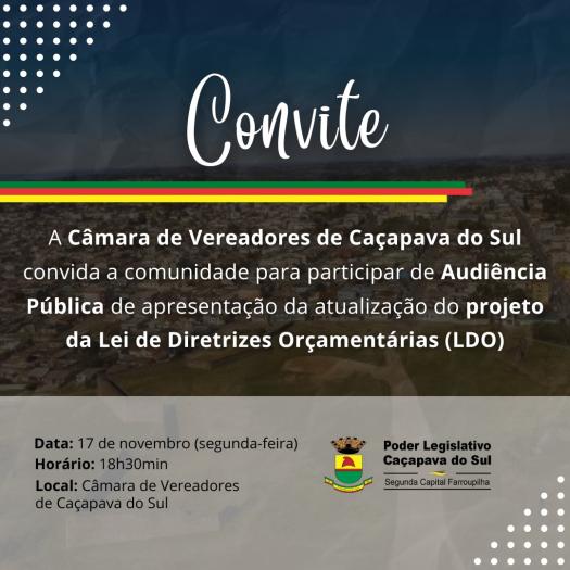 A Câmara de Vereadores de Caçapava do Sul realizará, na próxima segunda-feira (17), uma Audiência Pública para apresentação da atualização do Projeto da Lei de Diretrizes Orçamentárias (LDO) para o exercício de 2026.